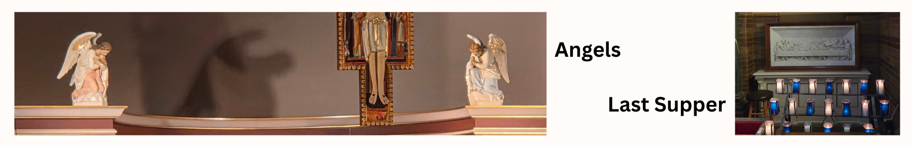 The angels now on display in the sanctuary were given to the parish by St. Ann’s Shrine in St. Louis when that parish closed, as was The Last Supper scene, placed near the baptismal font.
