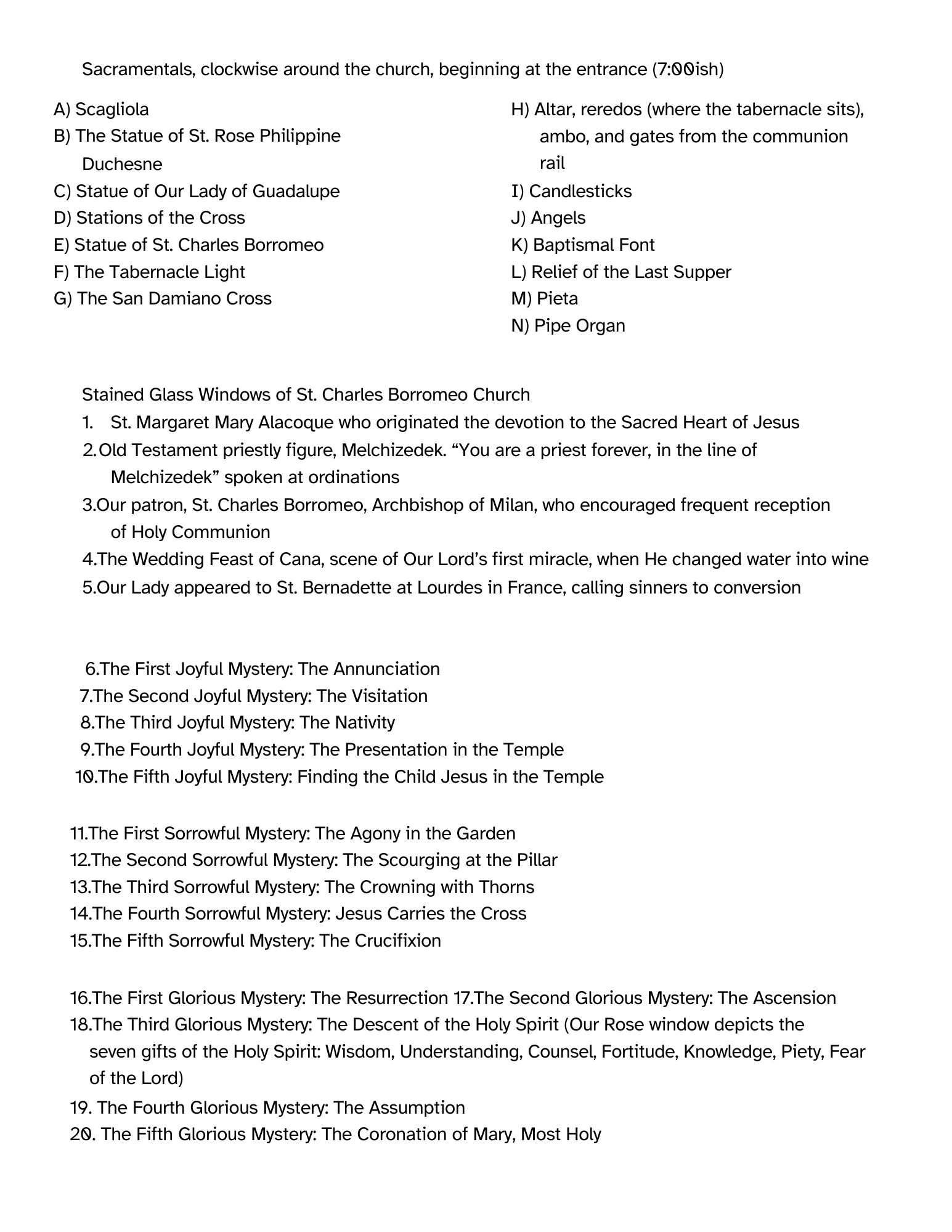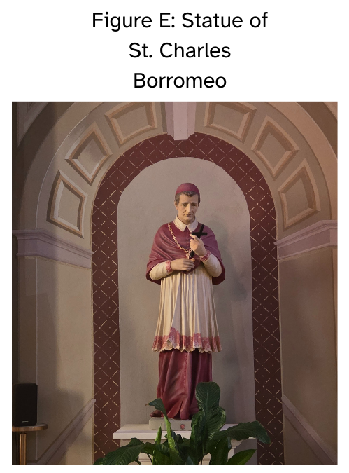 The statue of St. Charles Borromeo (figure E) was moved from the school foyer, repaired, and placed on the left side of the altar in 2017.