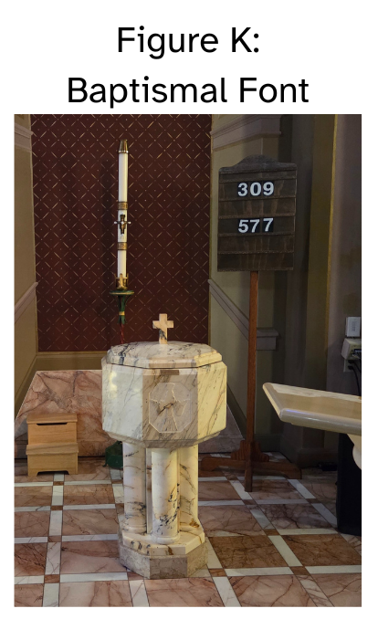 The Baptismal Font (figure K): Prior to the 1991 renovation, the baptismal area was located in the bridal preparation room, to the left as you enter the church. The font now has its place of prominence in the front of church, expressing the obvious connection between Baptism and the Holy Eucharist.