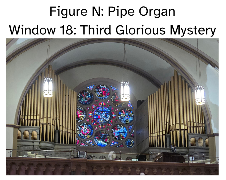 The Pipe Organ (figure N) in our choir loft had served many years, having been installed after the completion of the 1917 rebuild. Over the years, various mechanisms began failing, as did the leather moving parts. In the late 1990’s the organ had a major renovation, including new chest work, digital pipes, and a micro-processing system. To celebrate our renovated organ, the parish had a Rededication Concert in September 1998, filling the church with its magnificent new voice.