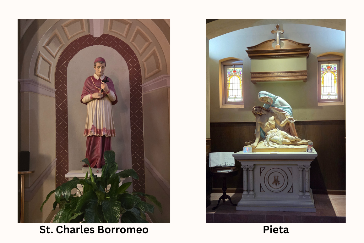 The Pieta was also added to the sanctuary following the renovation. The tabernacle was moved to its present place behind the altar and the statue of St. Charles Borromeo placed on the left side of the altar in 2017.