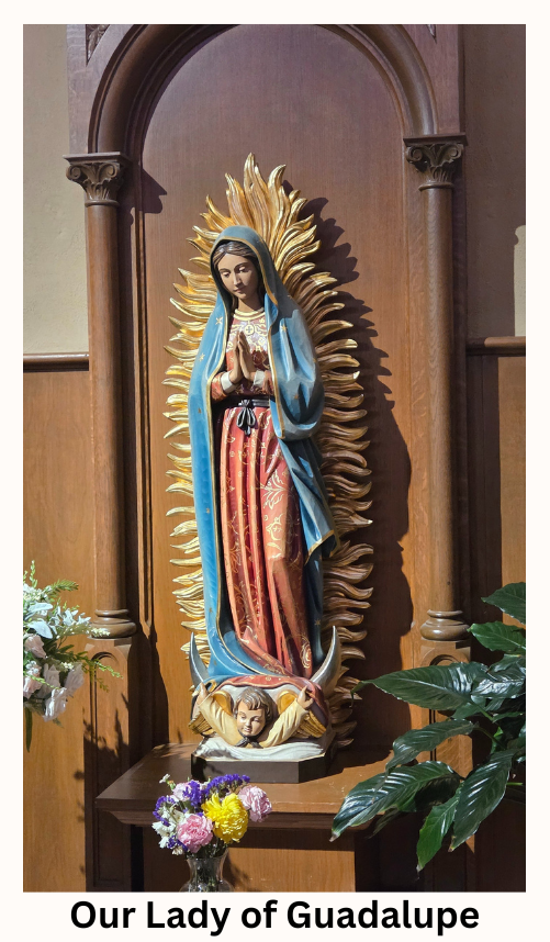Statue of Our Lady of Guadalupe: Rich in symbolism, this hand-carved piece was installed in the church in May 2006 as a reminder that our Blessed Mother, Our Lady of Guadalupe, is the Patroness of the Americas, as well as the Patroness of the Pro-Life cause. She holds a place of honor as well for our Latino members. The golden light surrounding the Lady is reminiscent of the “woman clothed with the sun” of Revelation 12:1, who has the “moon under her feet.” The angel supporting the Lady testifies to her royalty. The blue-green color of her mantle also represents royalty, while the stars tell us that she comes from heaven. The brooch under her neck is a symbol of sanctity. The black ribbon around her waist indicated not only her virginity, but its placement high above her slightly swollen abdomen also shows that the Lady is “with child,” further identifying her with the woman of Revelation 12 who is about to gift birth.