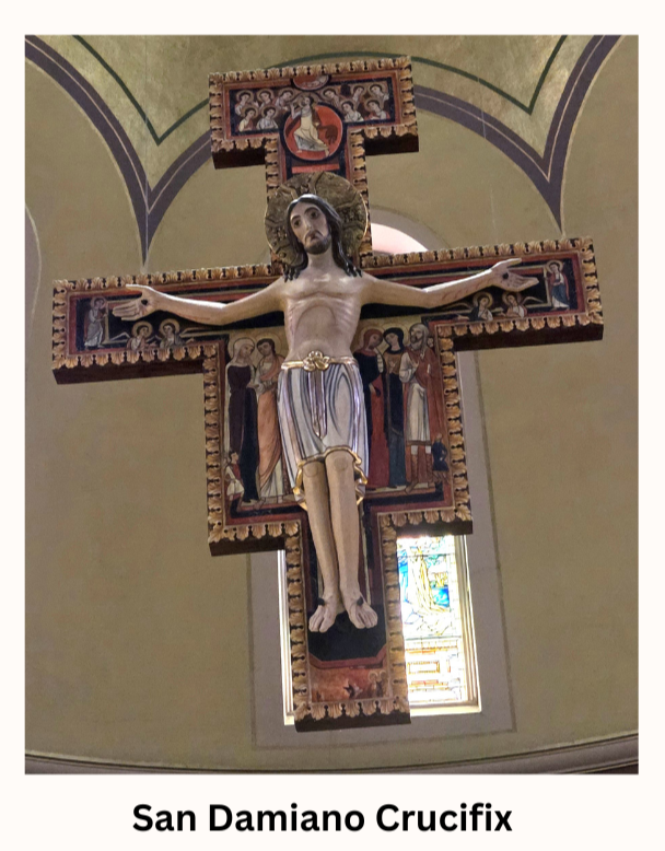 The San Damiano Cross: Modeled after a 12th century iconographic cross now hanging in Assisi, Italy, ours is an original, hand-carved work of art with the Corpus in three dimension to add depth to the figure of Jesus. He is depicted not as a corpse but as God Himself, radiating the hope of the Resurrection. Above his head is a portrayal of the Ascension: Jesus emerging from a red circle, holding a golden cross. A host of angels welcome Him into heaven, while at the very top is the right hand of God the Father extended in benediction. Angels also appear on both sides of the crossbar.