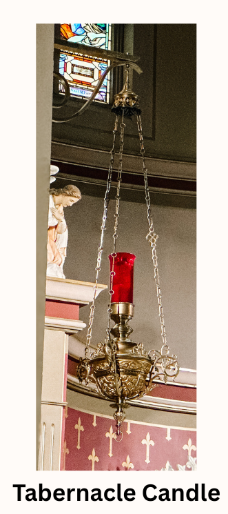 The Altar and Tabernacle: Part of the original altar in the third brick church of 1869, after the storm of 1917, the altar piece was restored and placed in the present church. At the outset of the 1967 renovation, the altar was gratefully placed in the home of one of our parishioners and was subsequently returned to the church building during the 1991 renovation.