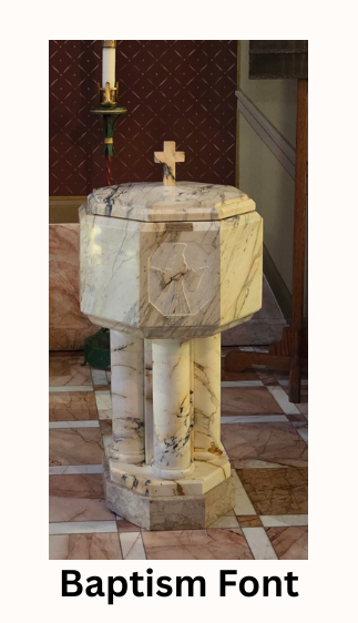 The Baptismal Font: Prior to the 1991 renovation, the baptismal area was located in the bridal preparation room, to the left as you enter the church. The font now has its place of prominence in the front of church, expressing the obvious connection between Baptism and the Holy Eucharist.