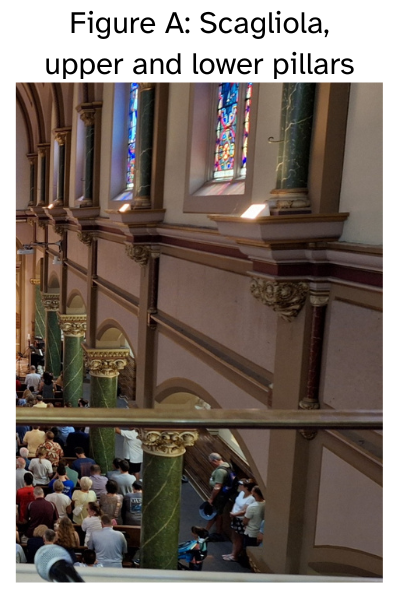 As part of the 1991 renovation in anticipation of the parish’s bicentennial celebration, many layers of paint were removed from the supporting pillars (figure A, throughout the church), uncovering this lovely finish called “scagliola,” a process done to plaster to imitate marble. The colors of the pillars set the tone for the palette of color used in the church interior you see today.