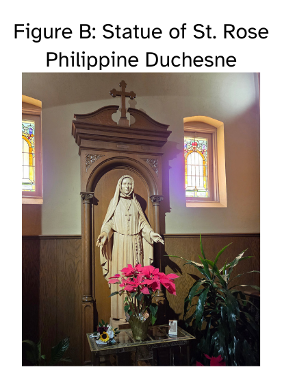 The statue of St. Rose Philippine Duchesne (figure B): It honors the saintly French nun who humbly came to serve the people of St. Charles in the early 1800’s. Her remains now rest in the Shrine directly across Fourth Street from our parish grounds.