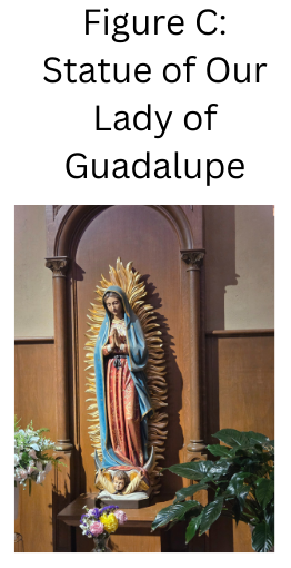 Statue of Our Lady of Guadalupe (figure C): Rich in symbolism, this hand-carved piece was installed in the church in May 2006 as a reminder that our Blessed Mother, Our Lady of Guadalupe, is the Patroness of the Americas, as well as the Patroness of the Pro-Life cause. She holds a place of honor as well for our Latino members. The golden light surrounding the Lady is reminiscent of the “woman clothed with the sun” of Revelation 12:1, who has the “moon under her feet.” The angel supporting the Lady testifies to her royalty. The blue-green color of her mantle also represents royalty, while the stars tell us that she comes from heaven. The brooch under her neck is a symbol of sanctity. The black ribbon around her waist indicated not only her virginity, but its placement high above her slightly swollen abdomen also shows that the Lady is “with child,” further identifying her with the woman of Revelation 12 who is about to give birth.