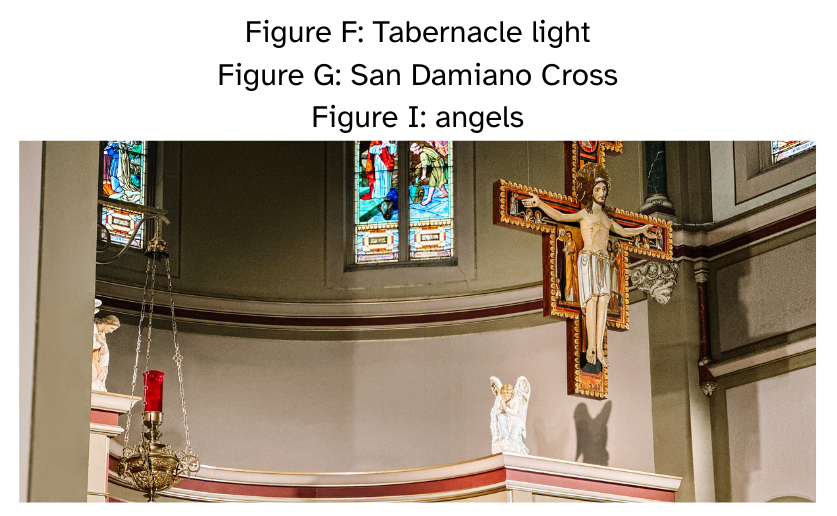 The angels (figures J) now on display in the sanctuary were given to the parish by St. Ann’s Shrine in St. Louis when that parish closed, as was The Last Supper relief (figure L), placed near the baptismal font.