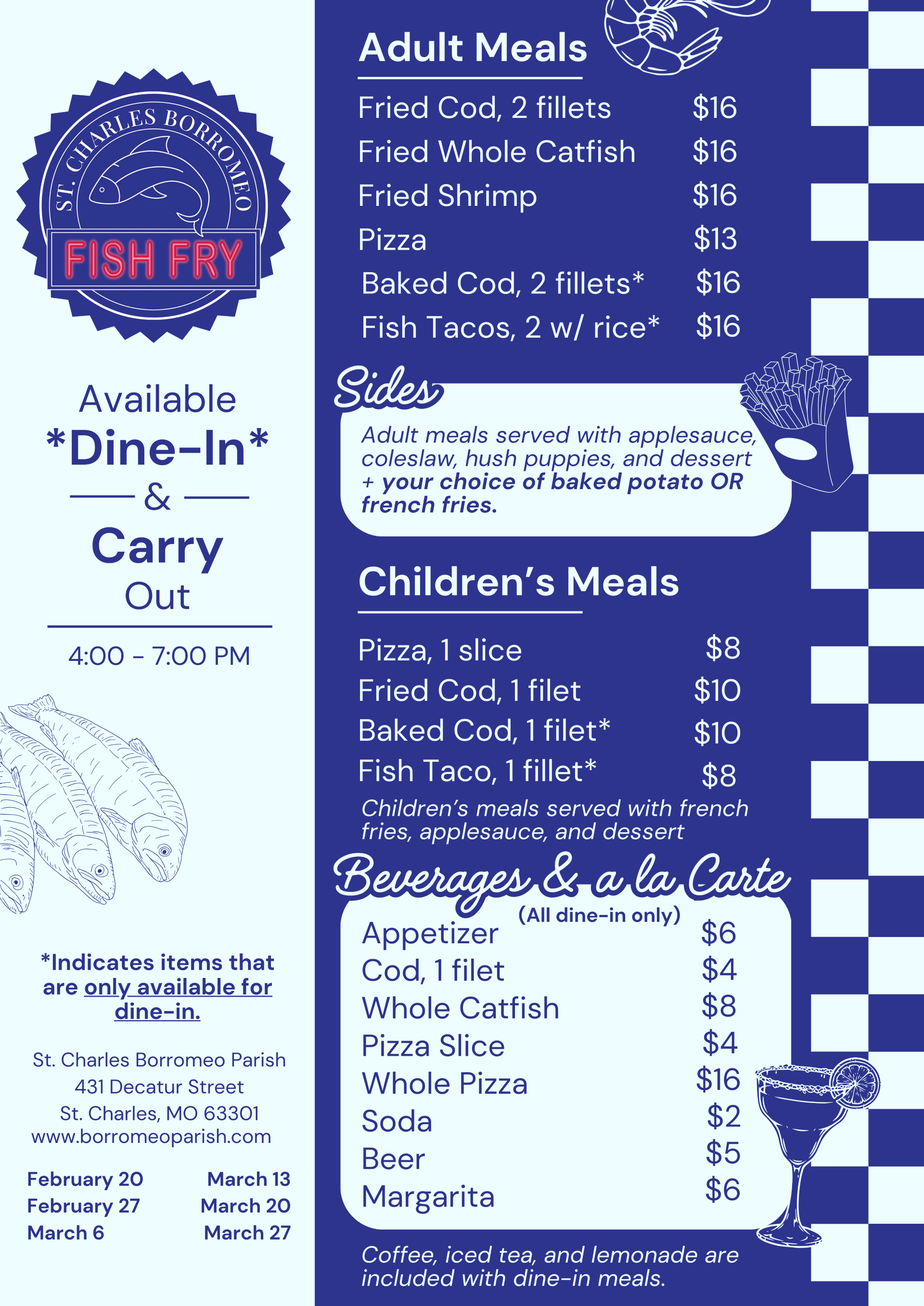 Held on the Fridays of Lent, except Good Friday, the Fish Fries are a good opportunity to meet people of the parish, lend helping hands in preparing, serving, and eating some good food. Lots of help is needed: on Thursday evenings to prepare, and on Friday to help set up, cook, serve, and clean up. This is a great opportunity for our Confirmation students to do service hours. The proceeds from the fish fries go directly into the parish operations. Contact Erica Moffitt, 314-799-3614.