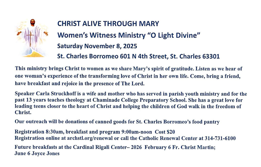 Christ Alive Through Mary Women's Witness Ministry "O Light Divine" Saturday Nov. 8 This ministry brings Christ to women as we share Mary's spirit of gratitude. Listen as we hear of one woman's experience of the transforming love of Christ in her own life. Come, bring a friend, have breakfast, and rejoice in the presence of the Lord. Speaker Carla Struckhoff is a wife and mother who has served in parish youth ministry and for the past 13 years teaches theology at Chaminade College Preparatory School. She has a great love for leading teens closer to the heart of Christ and helping the children of God walk in the freedom of Christ. Our outreach will be donations of canned goods for Meal A Month.